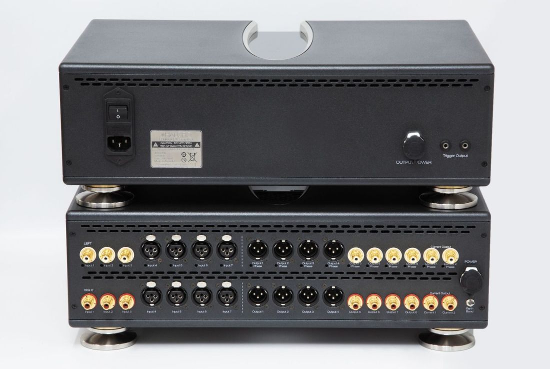 There are four balanced inputs and three unbalanced inputs per channel. Each channel has four balanced outputs, four unbalanced outputs, and two current outputs, a very rare option in audio. Current-loop interconnects are highly immune to environmental RF noise and can deliver significant performance improvements in noisy environments.