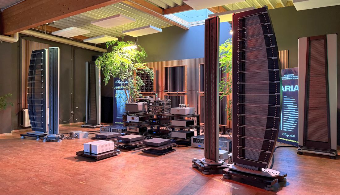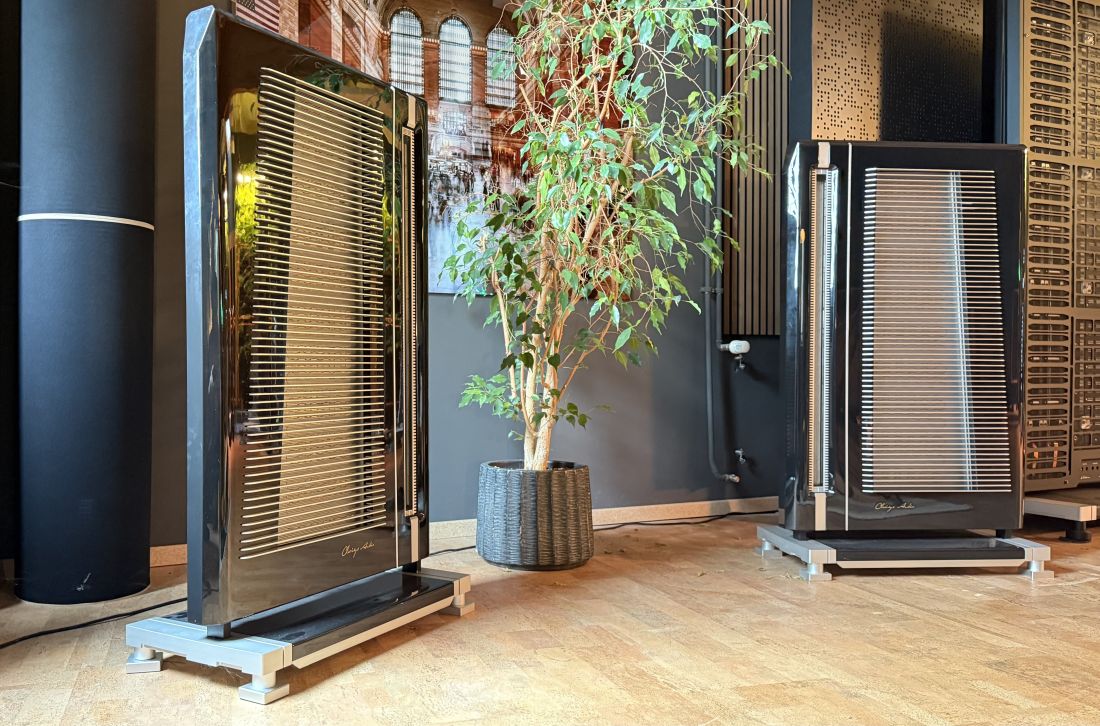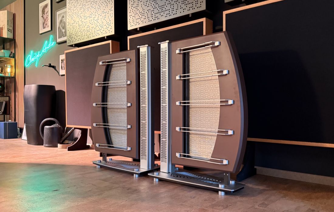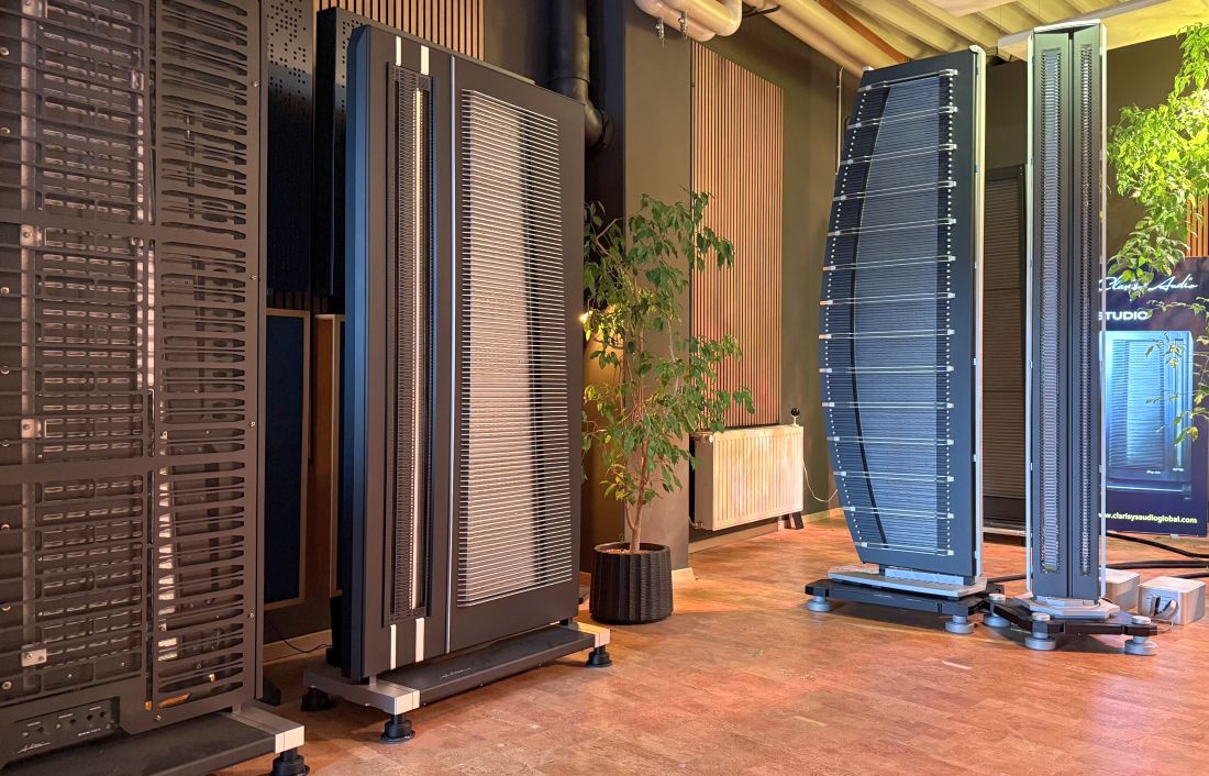 The Clarisys portfolio includes two additional models that were not on display: the 3-way Studio (between the Minuet and the Auditorium) and the brand-new four-panel Aria. Based on the Atrium, the Aria is a (relatively) more modest-sized system with smaller panels, yet still offers the freedom to position the bass and midrange/treble towers independently.